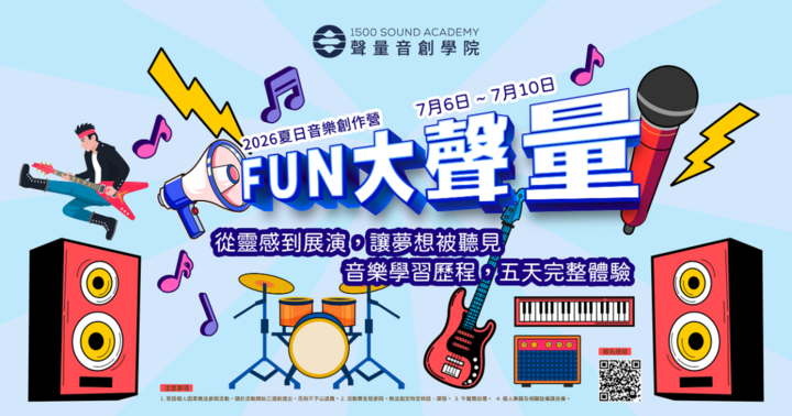 2026/07/06 10:00(+0800)1500 SOUND ACADEMY 聲量音創學院 FUN大聲量 - 2026夏日音樂創作營 從靈感到展演,讓夢想被聽見。音樂學習歷程,五天完整體驗。 亮點介紹 頂尖師資 + 新生代專業音樂人帶領,從靈感發想到舞台演出全攻略 專業教室&錄音空間,沉浸式學習體驗 從詞曲創作、編立即報名
